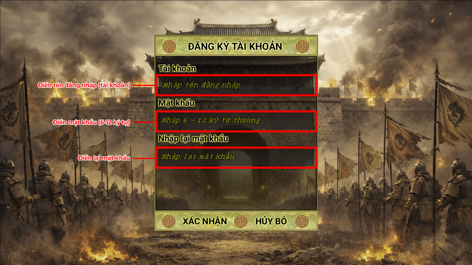 Lưu ý: Tài khoản khi tạo trong game sẽ trắng thông tin, các đại hiệp vui lòng vào trang chủ để cập nhật thông tin.