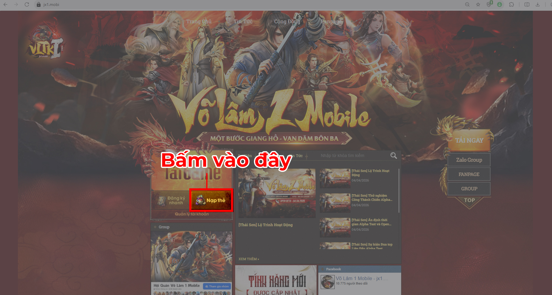 Bước 1: Truy cập vào Trang Chủ, chọn phần Nạp Thẻ hoặc bấm vào Link trang nạp chính thức.