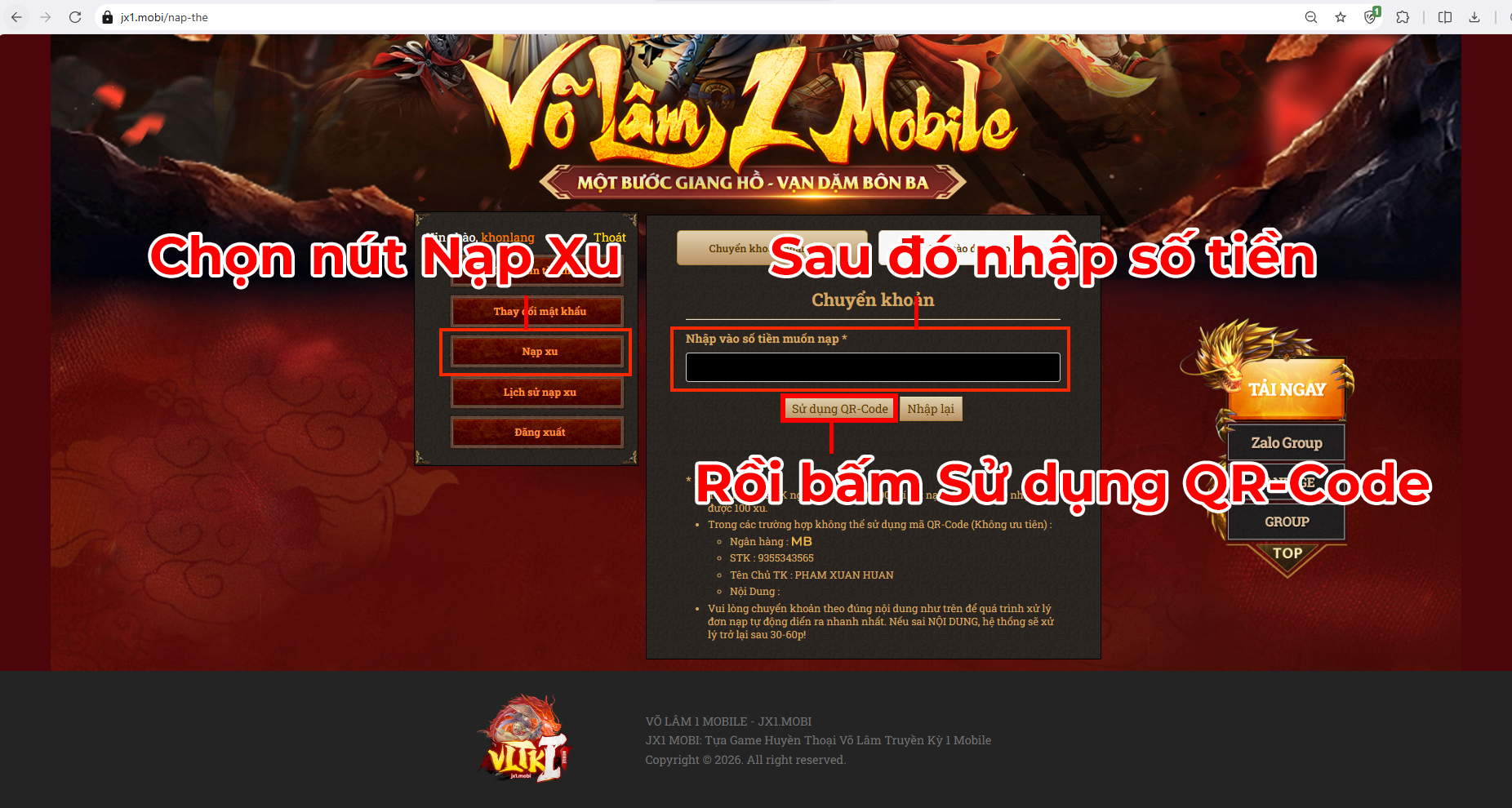 - Nội Dung: Vui lòng kiểm tra nội dung nạp trên chính tài khoản của đại hiệp, mỗi tài khoản sẽ có nội dung khác nhau.
